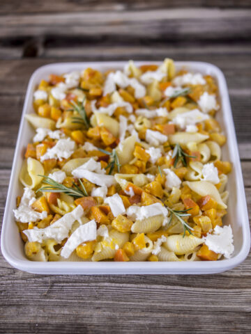 Einfaches Kürbisgericht: Conchiglie Rigate mit Hokkaido und mit Mozzarella überbacken